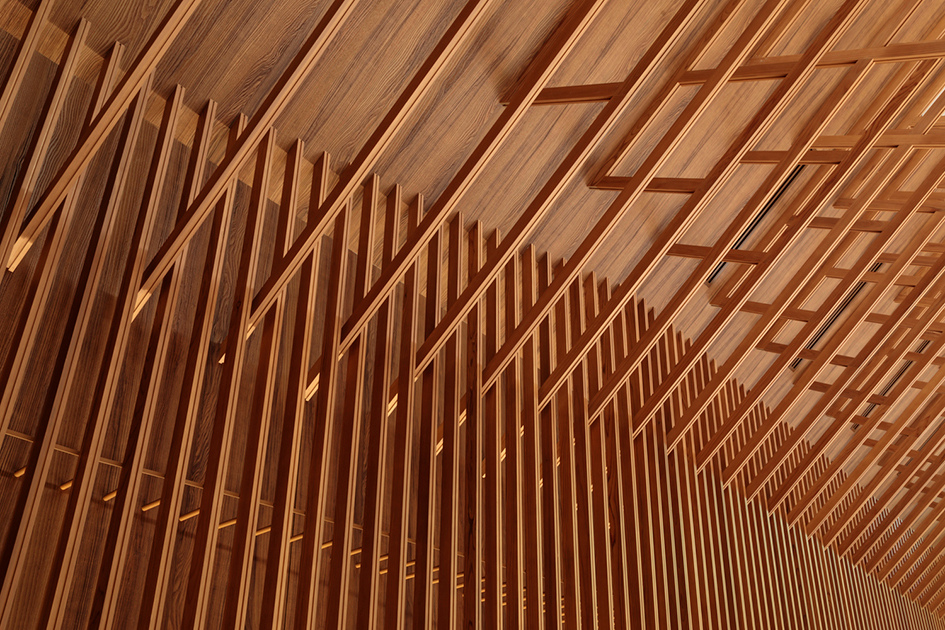 Το περίτεχνο ξύλινο πλέγμα στην οροφή, εμπλουτισμένο με έμμεσο φυσικό φωτισμό, αναπαριστά την ατμόσφαιρα ηλιακού φωτός που φιλτράρεται μέσα από τις πυκνές συστάδες δένδρων, όπως εκείνα που καταλαμβάνουν την γύρω περιοχή, δημιουργώντας μια αίσθηση συνέχειας και επαφής με την φύση.