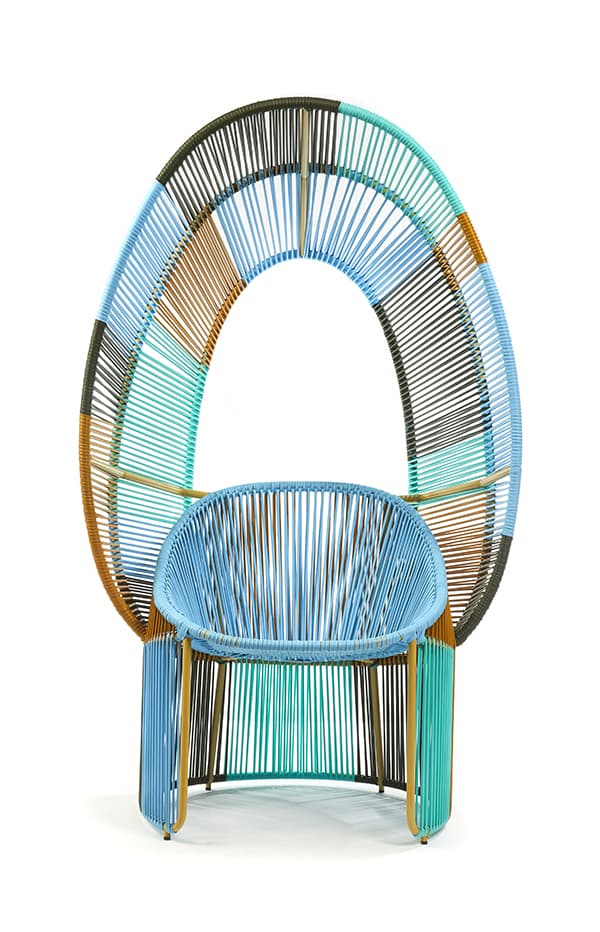 Η ειδική έκδοση La Reina Cocoon Chair από τη δημοφιλή συλλογή Cartagenas είναι εμπνευσμένη από τους αστραφτερούς χρωματικούς συνδυασμούς των φτερών των πουλιών κολίμπρι. Ο σχεδιαστής Sebastian Herkner χρησιμοποιεί κορδόνια από ανακυκλωμένο PVC σε μια παλέτα από πολλές και διαφορετικές αποχρώσεις: του πράσινου, του μπλε και του μπεζ. Για τη δημιουργία των πλαστικών κορδονιών, τέσσερα διαφορετικά νήματα υφαίνονται μεταξύ τους. Το αποτέλεσμα; Μια πανέμορφη καρέκλα που φαίνεται να αλλάζει χρώματα ανάλογα με τη γωνία από την οποία την βλέπει κανείς.