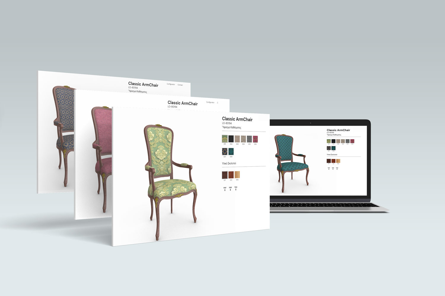 Προσφέρουμε στους πελάτες σας μια μοναδική εμπειρία αγοράς επίπλων, μετατρέποντάς τους σε δημιουργούς! Ο νέος 3D Configurator επίπλων υπόσχεται μια ολοκληρωμένη αγοραστική εμπειρία. Επιτρέψτε στους πελάτες σας να δημιουργήσουν τα έπιπλα των ονείρων τους, επιλέγοντας υλικά, υφάσματα, κεραμικές επιφάνειες, επιφάνειες ξύλων, χρώματα, και λεπτομέρειες της επιλογής τους με ένα απλό κλικ. Ο 3D Configurator είναι εύκολος στη χρήση, τόσο για εσάς όσο και για τους πελάτες σας, χωρίς να απαιτούνται ιδιαίτερες γνώσεις. Η προσαρμογή πραγματοποιείται σε τρισδιάστατο περιβάλλον με προσομοιώσεις φωτός και σκιάς για να γίνει το προϊόν εξαιρετικά ρεαλιστικό.