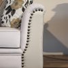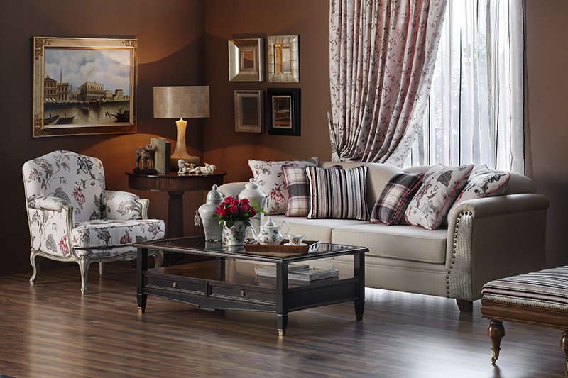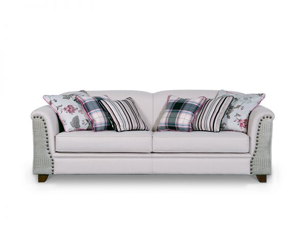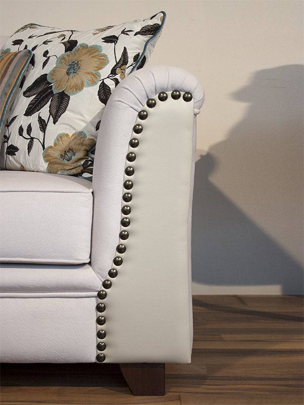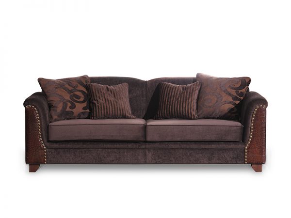 Καναπές από σκελετό μασίφ οξυάς και ξύλινα πόδια. Λεπτομέρειες από δέρμα και μεταλλικούς καμπαράδες. Τα μαξιλάρια του καθίσματος είναι από λάστιχο και το ύφασμα είναι αφαιρούμενο.