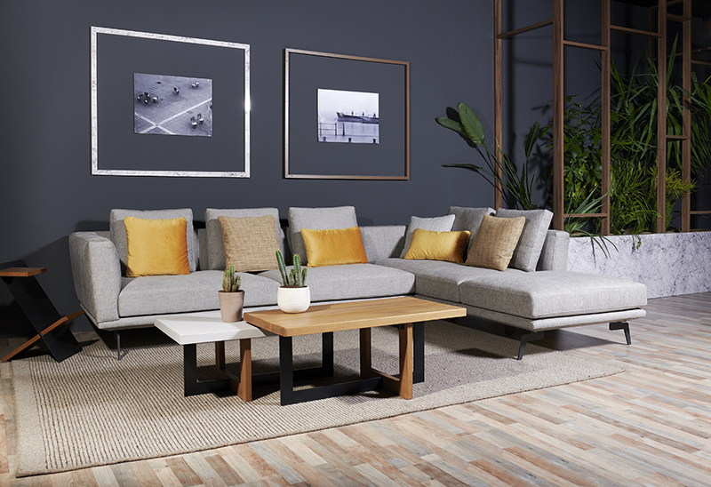 Καναπές από σκελετό μασίφ οξυάς και μεταλλικά πόδια. Τα μαξιλάρια του καθίσματος είναι από λάστιχο και της πλάτης περιέχουν πούπουλο χήνας. Τα υφάσματα από όλα τα μαξιλάρια είναι αφαιρούμενα.