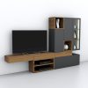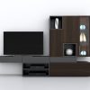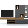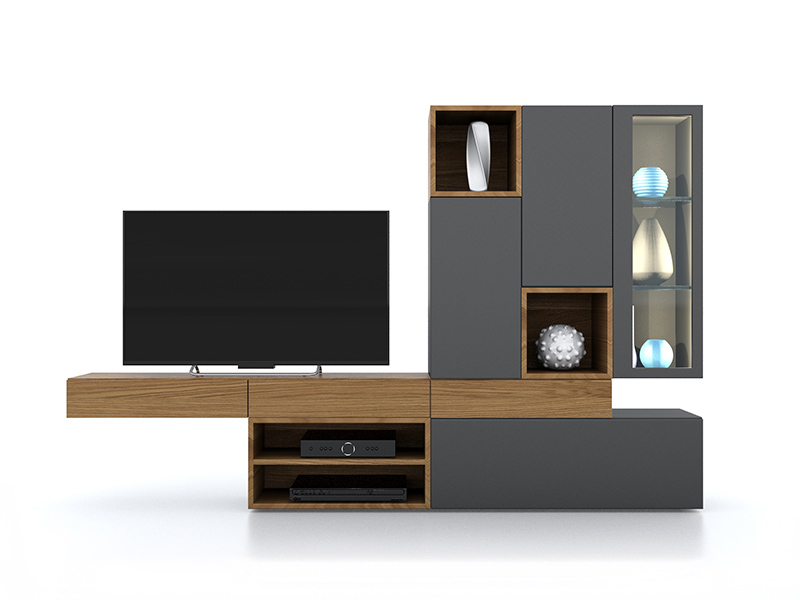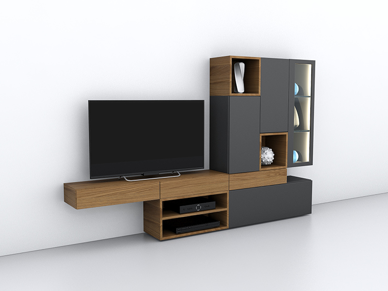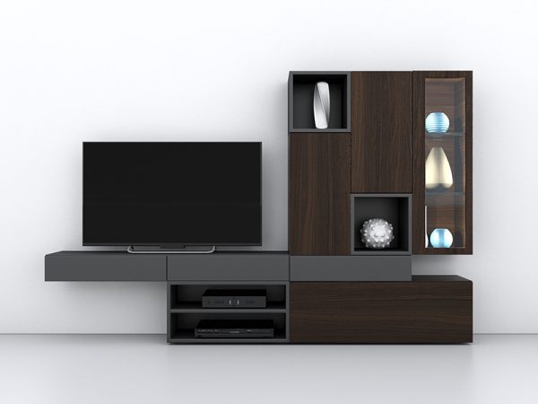 Σύνθεση που συνδιάζει χώρο για τηλεόραση, ράφια, συρτάρια, ντουλάπια και βιτρίνα. Διαθέσιμη σε διάφορες διαστάσεις και αποχρώσεις λούστρου και λάκας