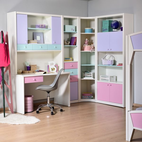 Οι ταμπλάδες και οι τραβέρσες του κρεβατιού, ο ταμπλάς του Προστατευτικού, οι πόρτες, οι μετώπες των συρταριών, τα ράφια και τα πλαϊνά των βιβλιοθηκών, το καπάκι του γραφείου και τα Σκαλοπάτια είναι κατασκευασμένα από MDF/CB επενδεδυμένο με καπλαμά οξιάς.