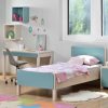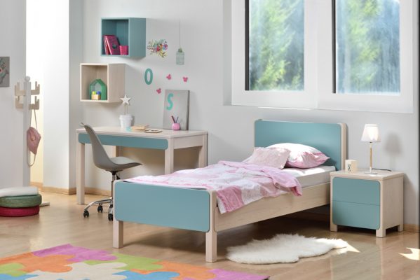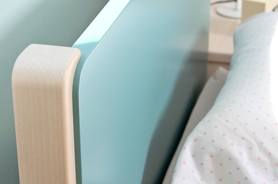 Οι ταμπλάδες και οι τραβέρσες του κρεβατιού, οι μετώπες των συρταριών, το καπάκι του γραφείου και του κομοδίνου, τα πλαϊνά και οι κρεμαστοί κύβοι είναι κατασκευασμένα από MDF/CB επενδεδυμένο με καπλαμά οξιάς.
