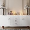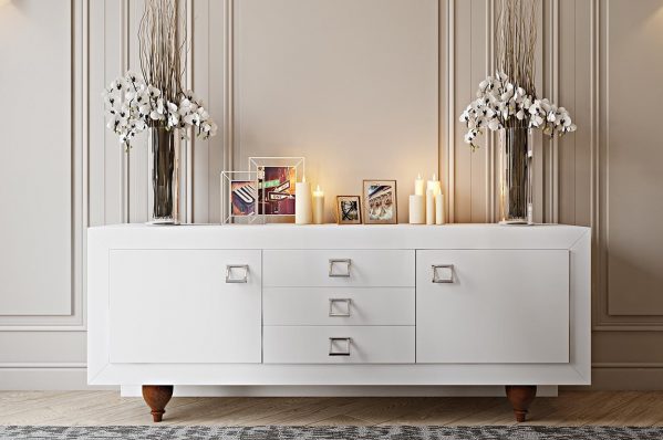 μπουφές είναι  σε λάκα γυαλιστερή με δύο πόρτες και τρία συρτάρια. Πόμολα