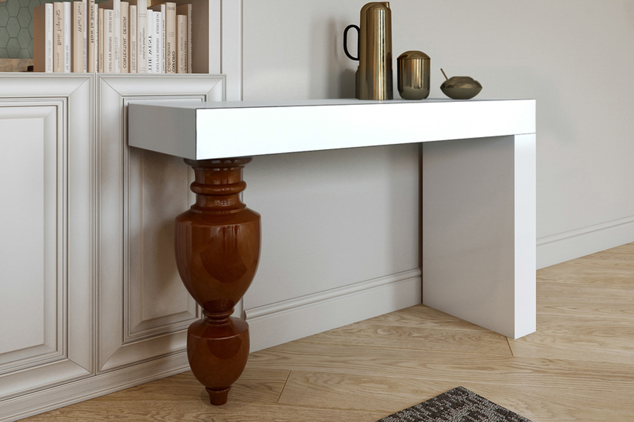 κονσόλα σε λάκα γυαλιστερή με συρτάρι . Στην  μία πλευρά του μασίφ πόδι από οξιά.
