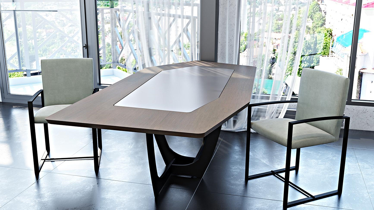 τραπεζαρίας με επιφάνεια σε δρυς , ενώ στο κέντρο του υπάρχει
