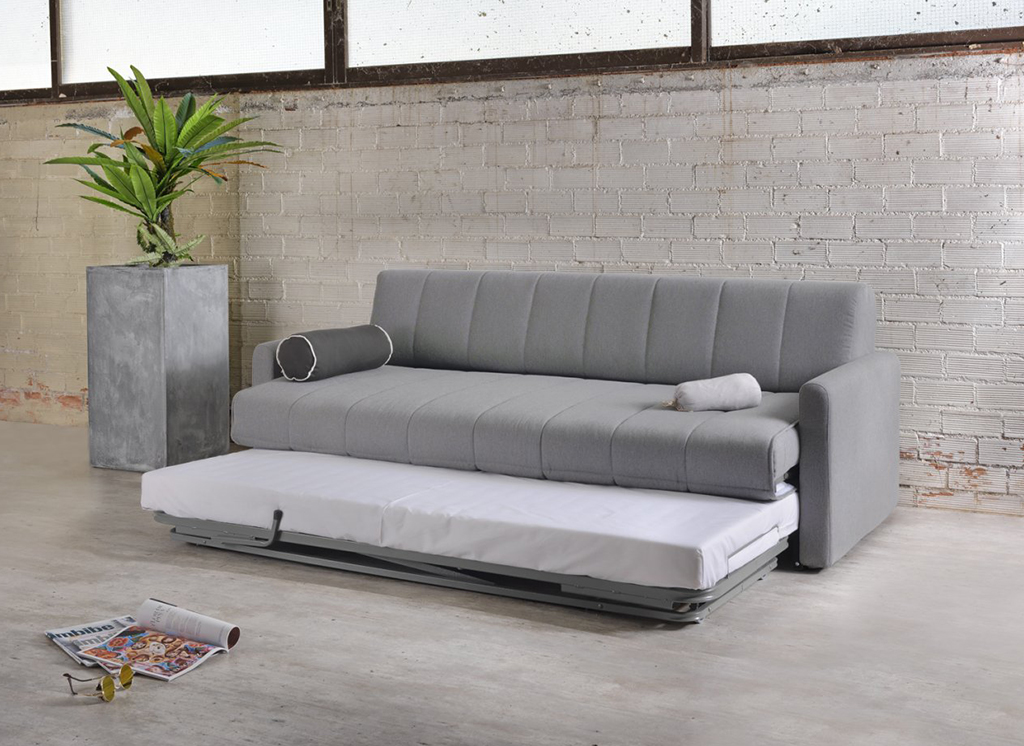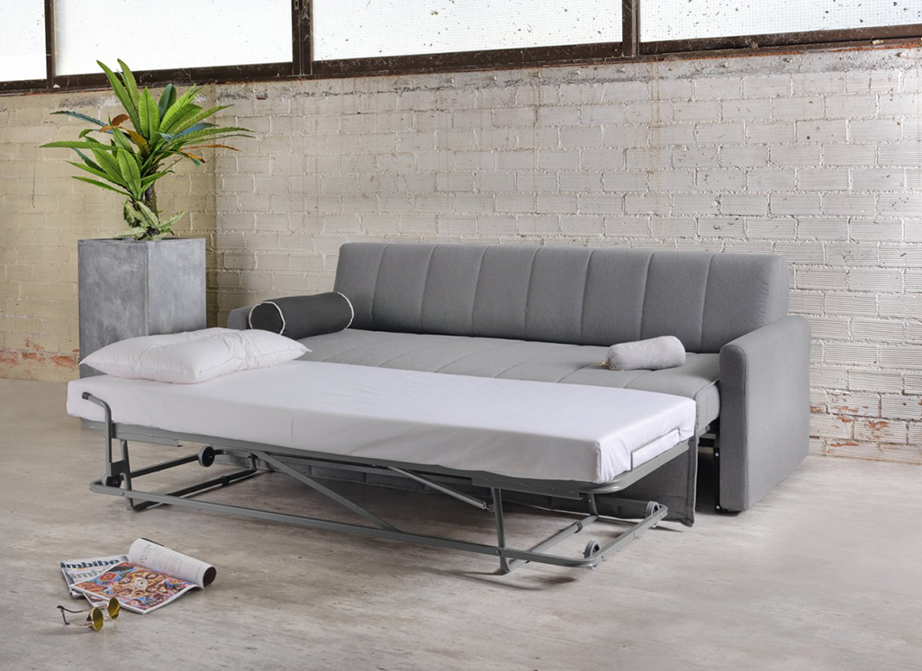 Τετραθέσιος καναπές που μετατρέπεται σε δύο μονά ή ένα διπλό κρεβάτι με τη βοήθεια του ενσωματωμένου τροχήλατου κρεβατιού. Το συνολικό του μήκος εξαρτάται από το μπράτσο που θα επιλέξετε.